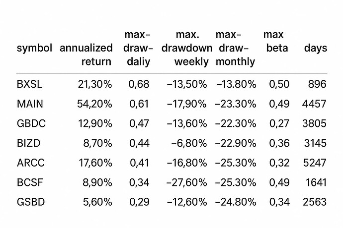 Moderate Sharpe Ratio — While some BDCs show moderate Sharpe ratios (0.29–0.68), drawdowns can be severe. During COVID, the worst monthly drawdowns ranged from -13.1% to -46.1%.